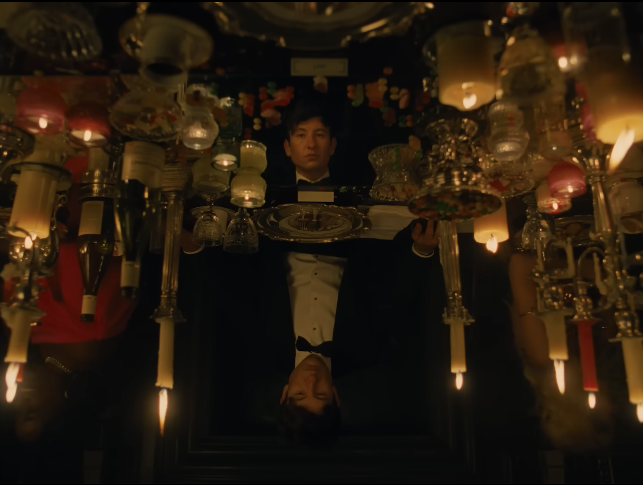 On a technical level Saltburn is brilliantly constructed. The cinematography is striking and the use of colour and framing can’t be applauded enough. I was captivated by how beautiful the architecture was presented, making the most of the locations and the repeating motif of mirror reflections was incredible. There are also several shots where characters are looking at the world through other materials, behind glass, or through the crack of a door, emphasizing the voyeuristic point of view. Similarly, the tightly framed shots created feelings of claustrophobia rather than intimacy. Saltburn is full of creatively lit scenes where characters are sometimes reduced to a striking silhouette. One scene where the room’s curtains are abruptly drawn leave the room bathed in a blood crimson red light. It’s incredible and completely in line with the mood of that scene.