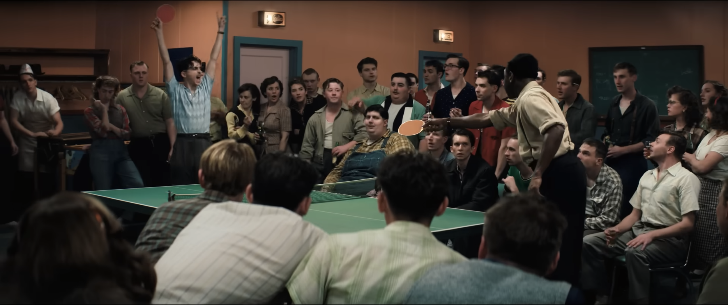 The sound design and music are also impeccable. The table tennis scenes are visceral, with rackets clicking and clacking and the crowd sounds swelling as the anticipation builds. Encompassing and at times overwhelming these scenes are deeply captivating. The music is also phenomenal, both the tracks that were selected and the propulsive original score, which reminded me at times of Bloodsport. It’s full of retro synths, pulsing bass, and epic choir vocals layered over each other. In the same vein, the licensed music contrasts the time period, opening and closing with recognizable 80s hits that are so on point thematically. A unique choice that makes this period piece feel timeless. It’s hypnotic and keeps you locked in for the entirety of this persistent 2 hours and 29 minute runtime.